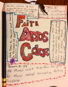 2. Use color in your journal: I am not all that artistic but adding a cheap assortment of colored pens to my $5 blank book keeps me in the word longer and opens me up to the scripture from a different part of my brain. Simply adding the act of doodling helps me pray more creatively and connect with the word.